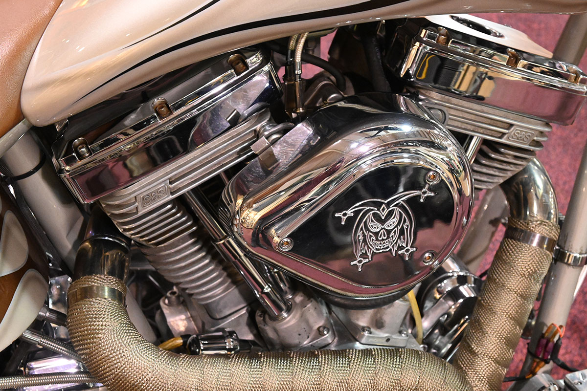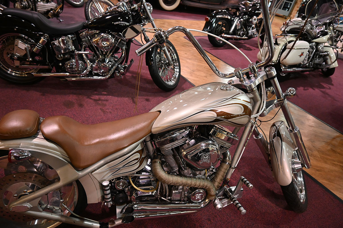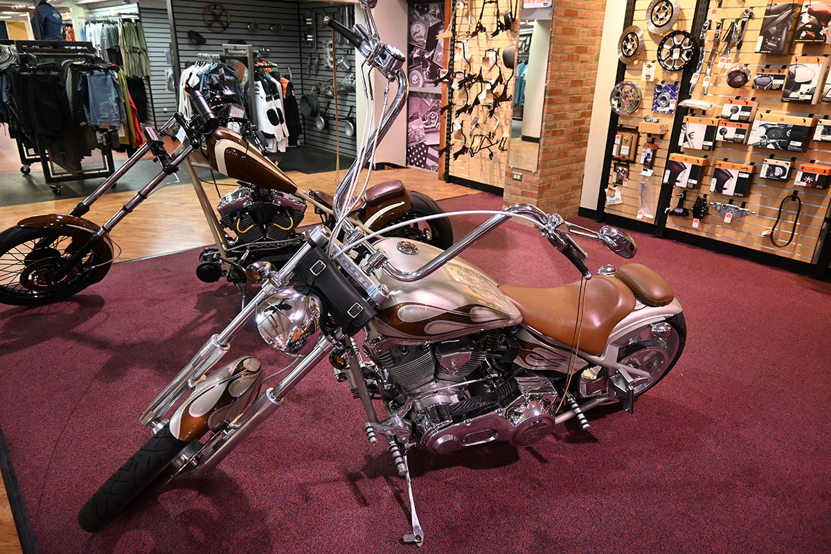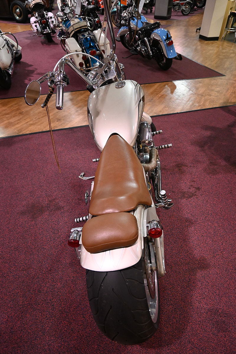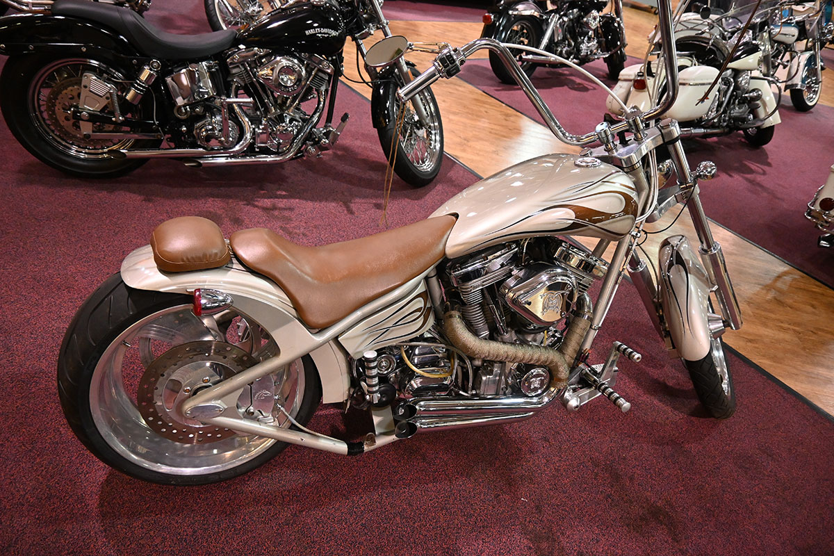A 2005 Custom Chopper finished in an elegant tan and silver colorway, presented in excellent condition. This build blends classic chopper proportions with refined detailing, giving it a timeless custom presence rather than a trend-driven look.